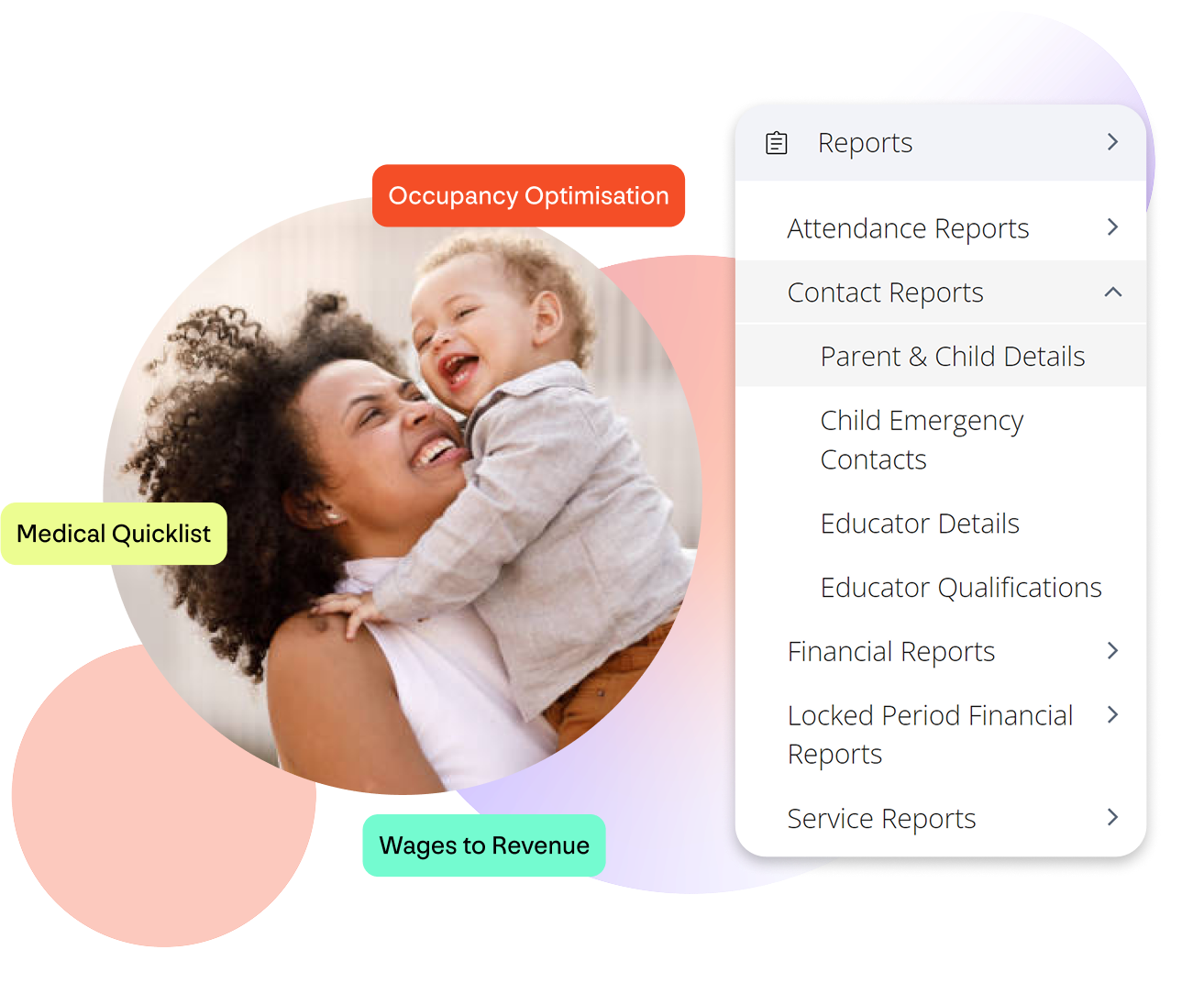 • In addition to attendance and financial reports, you have access to parent/child details reports, emergency contact information and even staff details and birthday lists.