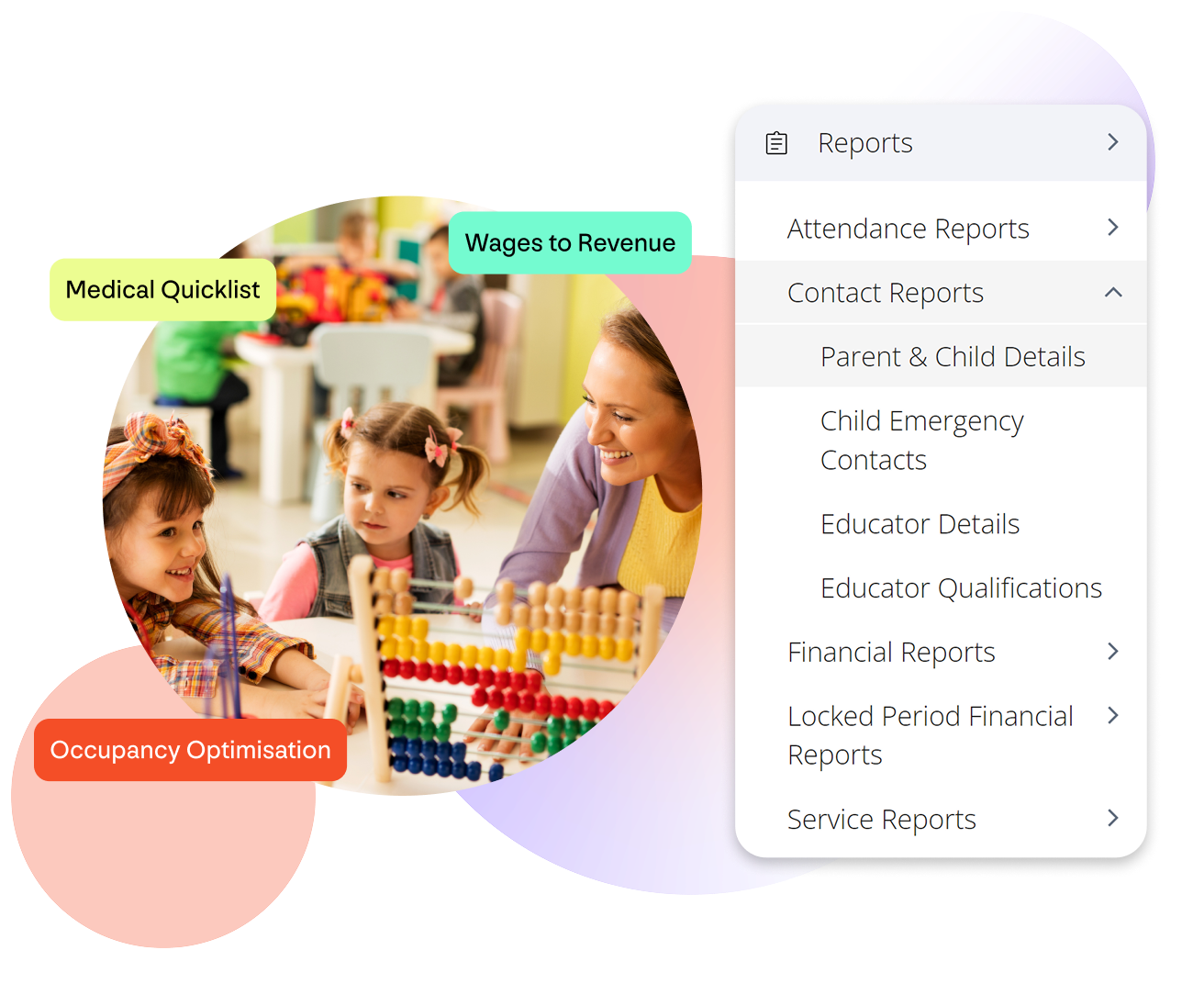 - In addition to attendance and financial reports, you have access to parent/child details reports, emergency contact information and even staff details and birthday lists.
